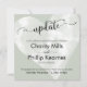 Diese Karte kann die perfekte Art sein, um anzukündigen, dass Ihr Hochzeitstag geändert wurde. Der Hintergrund ist in einem hübschen Weissgrün überzogen, das in jede gewünschte Farbe geändert werden kann. Überlagert wird dies durch ein teilweise undurchsichtiges Herz mit einer Vintag bemalten, weißen Wasserfarbenoberfläche, durch die die Hintergrundfarbe sichtbar wird. Ich habe einen unverwechselbaren modernen Schriftart mit wirbelnden Akzenten benutzt, um eine Grafik zu erstellen, die das Wort "Aktualisierung" darstellt, das oben positioniert ist, ziemlich groß. Verwenden Sie Vorlagenfelder, um Ihre persönlichen Daten hinzuzufügen und die Platzhaltermeldung nach Bedarf zu aktualisieren. Ich helfe Ihnen gerne bei der Anpassung, wenn Sie Hilfe benötigen. 57 //