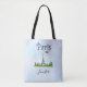 Eine Tüte mit einem skurrilen zeichn des Eiffelturms im Hintergrund, umgeben von grünen Bäumen. Ein rosa Herz und eine Pariser Typografie fügen einen gürnischen Flair hinzu. Der Hintergrund ist eine hellblaue Aquarelltextur. Personalisieren Sie mit einem Namen in einem extravaganten handgeschriebenen Schriftart.