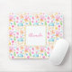 Ein Mauspad mit einem köstlichen und skurrilen Muster. Herz, Liebe Briefe, Muffins, Tulpen und Kirschen bringen Freude und Glück in dieses niedliche kleine Muster. Hübsche Pastellfarben. Ein weißes Quadrat mit einem goldenen Imitat-Folienabrand, der oben mit dem Text im Inneren platziert ist.