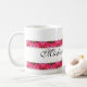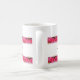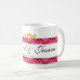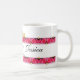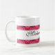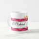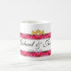 Mit originellen Kunstwerken von ZoeSPEAK, die für Liebhaber entworfen wurden, grenzt diese Tasse oben und unten an eine Band aus rosa Rosen und goldenen Herzen. In der Mitte des oberen Bandes von Rose gibt es zwei Bögen von goldenem Band, die ein Herz bilden, in dem sie sich in der Mitte verbinden. Zwei goldene Herzen schließen sich den Bögen in der Mitte an und vervollständigen das Design. Die Namen des Ehepaares sind in schwarzem Skript auf dem weißen Hintergrund zwischen den Rose, mit dem speziellen Datum unten. Alles ist Set, um personalisiert zu werden.