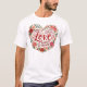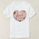 Herzförmige florale Typografie, ein herzförmiges Design gefüllt mit lebendigen Blumen umgibt die Worte 'Liebe ist immer die Antwort'. Die Komposition enthält dekorative Elemente wie Vögel und Herzen.