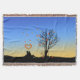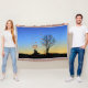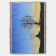 Romantische Herbstillustrierung mit einer Silhouette eines Pärchens, das im Gras neben einem Baum unter herzförmigen Blätter sitzt.