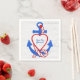 Roter und blauer Wasseranker mit Seilgrafik auf rustikal weiß gekalktem Holzhintergrund. Der Name des Bootes kann bearbeitet werden.