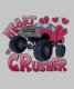 Eine mutige und spielerische Illustration eines rosa Monsterwagens mit übergroßen Reifen, umgeben von gebrochenen Herzgrafiken. Das Design enthält die Worte "HERZ CRUSHER" in großen, lebhaften rosa Buchstaben, die Power, Spaß und eine freche Drehung auf Liebe und Herzschlag symbolisieren.
