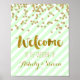 Herzlich willkommen in unserem Hochzeitsschild-Poster in hellpastellfarbenem Minzgrün und weiß gestreiftem Muster mit goldenen Konfetti und handgeschriebenen Stilschriften.