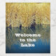 Herzlich willkommen bei den Gästen des Seehauses mit diesem einfach zu benutzenden Weinflaschenlabel mit dem großen braunen und grünen Seegras am Ufer, das sich im hellblauen Wasser widerspiegelt. Die Worte "Willkommen am See" tauchen im hellblauen Wasser in weißem Schriftart auf. Alle Texte können auf Wunsch angepasst werden.