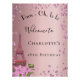 Ein modernes, stilvolles und glamouröses Begrüßungspaket für eine 18. Geburtstagsfeier (oder jedes Alter) mit Pariser Themen. Ein rot-rosa metallischer Hintergrund mit rosa glitzernden Herzen und dem Eiffelturm mit einigen Blume. Personalisieren und einen Namen hinzufügen.