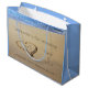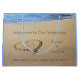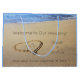 Eine Begrüßungstasche für eine Hochzeit am Strand, mit den Initialen der Braut und des Bräutigams, die in einem Herzen im Sand, am Strand, geschrieben sind. An der oberen Grenze sehen wir einen blauen Ozean Der Text ist braun, wie das Sandherz. Das Strandherz-Foto liegt bei Petr Kratochvil von Public Domain Pictures und ist für kommerzielle Nutzung kostenlos. Die Seitenwände der Tasche sind hellblau, wie der Ozean und der Himmel.