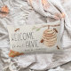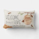 Begrüßen Sie dieses niedliche Bienenschaukissen mit Aquarellbildern von Honigbienen, Wabenrüben und einem Bienenstock, das in Elfenbeinbuchstaben "willkommen in unserem Bienenstock" ist. Personalisieren Sie Ihren Familiennamen ganz unten.