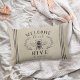 Begrüßen Sie dieses niedliche Bienengezwitscher-Kissen mit einer Vintagen Honigbienenabbildungen, die mit botanischen Blätter und Seilbespannungen auf einem weichen beigen Hintergrund geschmückt sind. "Willkommen in unserem Bienenstock" erscheint in Holzkohlebriefen. Personalisieren Sie Ihren Familiennamen ganz unten.