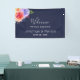 Ein Hochzeitsbanner, der sagt: Willkommen bei unserer Hochzeit mit Ihren personalisierten Namen. Entworfen mit einem hübschen Bouquet von Aquarellfarben-Rose und anderen bunten Flecken, Blätter und Ästen entlang der oberen und unteren Ecken. Set auf einem marineblauen Hintergrund.