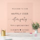 Moderne Hochzeitsrezeption mit einem klaren Acrylzeichen mit dem Titel "Welcome To Our Happily Ever After Party" in einem Mix aus einfacher Typografie und einem eleganten Drehbuch mit Swashes: "Wir sind so froh, dass du hier bist", verbinden deine Vornamen mit Herz und Empfang. Ideal für Empfänge nach einer Veranstaltung oder einer kleinen privaten Hochzeit.