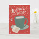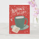 Diese skurrile und niedliche Urlaubskarte zeigt ein Gemälde einer Tasse Tee, in dem der Gruß "Warmste Wünsche" in einer typisch roten und grünen Farbpalette zu Weihnachten von der Hand geschrieben wird. Das Innere vervollständigt die Sentiment-Lektüre "Haben Sie einen testaziösen Urlaub".