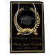 Diese schöne Geschenktasche ist perfekt, um den Absolventen in Ihrem Leben zu gratulieren. Der goldene Lorbeerkranz mit Graduierungsmütze auf schwarzem Hintergrund. Der Text ist Gold und lautet: Herzlichen Glückwunsch! Mit einem Ort, um den Namen des Absolventen und alle anderen speziellen Details, die Sie möchten (Schulname, Abschluss verdient, Ehre erreicht, oder eine besondere Note.). Perfekte Geschenktasche für Ihren Absolvent
