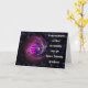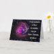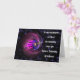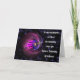 Herzlichen Glückwunsch Karte für die Akzeptanz in der Raumfahrtakademie. Das Design ist ein Lavendelnebel, der eine leidenschaftliche Blume umhüllt, die wie ein Raumschiff aussieht. Der Hintergrund ist schwarz und der Himmel voller Sterne. Die Wörter auf der Vorderseite sind dauerhaft, das Innere kann geändert werden.