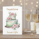 Eine Glückwunschkarte für frisch verheiratete Kinder. Sie können die Namen der Braut und des Bräutigams auf der Vorderseite im personalisierbaren Bereich hinzufügen. Ein wunderschöner weißer, rosa und schlauer grüner Hochzeitstorte mit einem sentimentalen Gedicht im Inneren.
