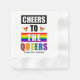 Ein lustiger Cocktail oder eine andere Serviette mit den Namen des homosexuellen Paares und einer typografischen Botschaft des Regenbogens; "Beifall für die Queers" für eine wunderbare Feier in der LGBTQ-Community.
