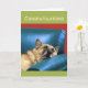 Herzlichen Glückwunsch zu einem guten Job mit Deutscher Hirte, Papier Grußkarte. Nach einem anstrengenden Tag entspannt sich ein deutscher Schäferhund auf einem blauen Ledersofa. Art, Bild und Vers Copyright © Shoaff Ballanger Studios, 2022.