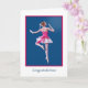 Die hübsche kleine Ballerina trifft eine Pose in ihrem rosa-weißen Kostüm auf blauem Hintergrund. Sie trägt weiße Handschuhe und hat ein weißes Band im Haar. Ihr Rücken wird dem Publikum zugewandt. Es macht ein großartiges Ballettmotiv-Bild auf dieser farbenfrohen Grußkarte, die Glückwünsche zu einem Tanzabend bietet.
