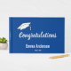 Dieses Gästebuch in Blau und Weiß hat einen weißen Graduiertendeckel in der oberen links Ecke. Im Text anzeigen steht 'Glückwunsch' in einem weißen Skript. Sie können das Gästebuch mit dem Namen des Absolventen in weißem Text personalisieren. Sie können sogar das Klassenjahr unter dem Namen hinzufügen. Außerdem gibt es Text für den Namen und das Klassenjahr des Absolventen auf der Wirbelsäule. Alle Texte können bearbeitet oder gelöscht werden.