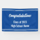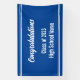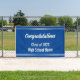 Dieses tiefblau-weiße Banner hat eine Textvorlage, die Sie bearbeiten können, um die geschlossen Klasse Ihrer Schule zu beglückwünschen. Wie gezeigt, ist die oberste Zeile ein weißes Skript, das "Glückwunsch" liest. Die zweite Zeile kann bei Bedarf in das Klassenjahr geändert werden. Die letzte Zeile ist für den Schulnamen. Alle Texte können bearbeitet oder gelöscht werden.