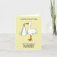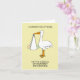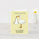 Ein Cartoon eines Riesenstorches, der ein neues Kind in einem weißen Blatt hält, Set vor einem hellfarbenen, lachsfarbenen Hintergrund. Die Worte "Herzlichen Glückwunsch zur Geburt Ihres ersten Enkelkindes" begleiten das Bild.