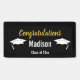 Teilen Sie die Leistung Ihres Absolventen mit allen. Dieses schwarz-weiße Banner hat zwei weiße Graduiertenkappen auf beiden Seiten des Namens des Absolventen, der in der Mitte ist. Imitate (nicht Folie) Gold Skript sagt "Glückwunsch" an der Spitze. Im unteren Teil gibt es einen Ort, um das Jahr des Abschlusses des Absolventen hinzuzufügen.