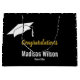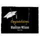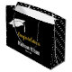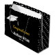 Ein Graduiertendeckel ist über Imitaten Gold-Display-Text, der sagt "Herzlichen Glückwunsch". Am unteren Rand befinden sich zwei Zeilen weißer Bildschirmtext für den Namen des Absolventen und das Jahr, in dem der Schüler abgeschlossen wird. An den Seiten dieser schwarzen Geschenktasche befindet sich ein Muster weißer Kappen des Absolventen.