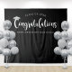 Extra große Abschluss Zeremonie oder Party Hintergrund für alle Fotos der Absolventen! Das Design ist minimalistisch und bietet ein modernes weißes "Gratulationen" Kalligraphie-Skript-Design mit silbergrauem Akzent auf schwarzem Hintergrund. Personalisieren Sie den benutzerdefinierten Text mit dem Klassenjahr und dem Schulnamen.