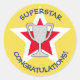 Dieser hellgelbe Aufkleber enthält Text, den Sie für Ihre eigenen Lobeswörter bearbeiten können. Der Standardwert in dunkelblau ist "SUPERSTAR" und "GRATULATIONS". Das Design zeigt eine Trophäe (das könnte zum Beispiel für sportliche oder akademische Leistungen sein) mit einem roten und weißen Stern dahinter.