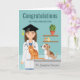 Herzlichen Glückwunsch an einen Tierarzt zu seinem Abschluss mit diesem personalisierbaren Design, in dem Desteis originelle niedliche Cartoon-Illustration einer Tierärztin in einem Untersuchungsraum einer Tierklinik gezeigt wird. Der Tierarzt trägt eine schwarze Graduationskappe mit einer gelben Tassel, einem weißen Labormantel, blauen Peelings, und sie hat ein Stethoskop um ihren Hals. Der Tierarzt hat braunes Haar und einen lächelnden Gesichtsausdruck. An der Wand befinden sich zwei braune, schwimmende Regale mit einer grünen Pflanze und zwei kleinen, auf sie platzierten Medizingläsern. Vor dem Tierarzt sitzen eine orangefarbene Katze und ein brauner und weißer Welpe auf einem grauen Untersuchungstisch. Es gibt auch personalisierbare Textbereiche, die ideal sind, um eine benutzerdefinierte Nachricht zusammen mit dem eigenen Namen des Absolventen zu schreiben.