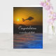 Herzlichen Glückwunsch zum ersten Solo Flug in Helicopter, Papier Grußkarte. Glückwunsch auf Ihrem ersten Solospin. Dramatische Szene eines Hubschraubers, der über Wasser fliegt, mit einem Sonnenuntergang und der Sonne dahinter. Ändern Sie den Text und den Schriftart auf der Kartenabdeckung, wie Sie möchten. Art, Bild und Vers Copyright © Shoaff Ballanger Studios, 2022.