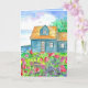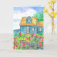 Ein Glückwunsch zu Ihren neuen Zuhause-Grüße mit einer Hütte auf einem See mit wütenden Wildblumen wie rosa Süßerbsen und Lupinen mit Bäumen und Vögeln, die durch die flauschigen Wolken im Himmel illustriert mit Tinte und Aquarell. Sie können den Text und die Farbe im Inneren an Ihre Bedürfnisse anpassen.