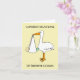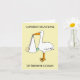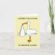 Eine einfache Abbildung eines Storchs, der ein Baby in einem weißen Blatt hält, das vom Schnabel hängt. Das Bild hat einen lachsfarbenen Hintergrund und wird von den Worten "Herzlichen Glückwunsch zum Cousin" begleitet.