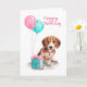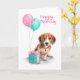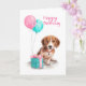 Sehr niedlicher Hund mit zwei zarten Luftballons und Geschenk, Glückwunsch zum Geburtstag zu meinem besonderen Freund