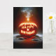 Ein glühender Kürbis, der mit den Worten "Happy Birthday" gemeißelt wurde, zeichnet sich durch die Dunkelheit aus, wobei von oben Rauch aufsteigt, was eine einzigartige festliche Atmosphäre schafft. Text kann geändert werden.