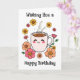 Eine süße Karte wünscht jemandem einen guten Geburtstag und einen Tag voller Dinge, die sie Liebe! Die Vorderseite der Karte ist eine niedliche kichkische Tasse warmen Kaffees, umgeben von rosa Blume.