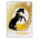 Ein goldenes Hintergrunddesign mit der schwarzen Silhouette eines Weihnachtspferdes, das einen Goldbogen trägt. Eine schöne Urlaubskarte für den Pferdeliebhaber in Ihrem Leben.