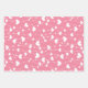 Drei Blätter koordinierendes Packpapier. Rosa und weiße Herzen, rosa und graue Herzen und ein hübsches Schmetterlingsmuster. Ideal, um Geschenke für sie zu verpacken.