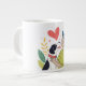 Genießen Sie Ihr Lieblingsgetränk mit dieser fröhlichen Tasse mit einem Jungen in einem grünen Shirt und einer blauen Baseballkappe, die seinen Schwarz-Weiß-Hund mit einem roten Kragen umarmt. Ein großes rotes Herz schwebt über ihnen und symbolisiert ihre Liebe und Bindung. Set vor einem weichen Lavendelboden mit spielerischen Blätter, Punkten und funkelnden Sternen, dieses herzerwärmende Design ist perfekt für Hundefreunde jeden Alters.