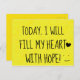 Dies ist eine niedliche und sehr "glückliche", hellgelbe Postkarte mit einer glücklichen Bestätigung, die sagt: "HEUTE WERDE ICH MEIN HERZ MIT HOFFNUNG FILL!" geschrieben in riesigen schwarzen Buchstaben neben einem niedlichen schwarzen Herz und einem glücklichen Gesicht! Toll, ein großes Lächeln auf das Gesicht zu legen und Ihr Herz mit Hoffnung jeden Tag füllen!
