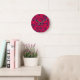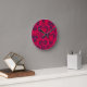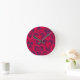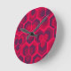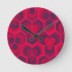 Diese Wanduhr hat ein geometrisches Design von Sechsecken in Sets von drei, die wie Blume in magenta und lila aussehen.