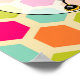 Eine glückliche Honigbiene mit seiner Honigmelone, die in einem durchsichtigen Kreis mit schwarzer Grenze stehend ist. Ein cooler sechseckiger Bienenstock-Hintergrund in Vintagen Farben wie Rosa, Blau, Orange und Grün.