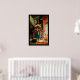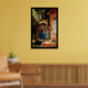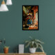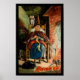 Dekorieren Sie Ihre Wand mit einem fantastischen Vintagen Halloween-Poster mit einer Hexe, die mit ihrer Eule und Katze am Kamin sitzt.