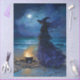 Eine zauberhafte Hexe steht an einem leuchtenden Kessel unter dem Himmel des Mondes.