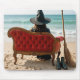 Eine Hexe in einem breit gestrahlten Hut sitzt auf einem Sofa aus rotem Samt, das den Wellen des Ozeans gegenübersteht, mit einem Besen und zwei Stiefeln auf dem Sand neben ihr