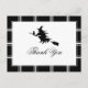 Eine niedliche Dankeschön Postkarte mit einer Hexe auf einem Besen vor einem weißen Hintergrund.