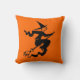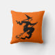 Hexe des Halloween-Dekorationskissens | auf Besen. Orange Kissen mit Illustration einer beängstigenden Hexe auf einem Besen.