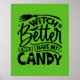 Dieses Halloween-Design enthält den spielerischen Satz "Hexe hat besser Süßes", der in einem dynamischen, gemischten Schriftart-Layout angeordnet ist. Das Wort "Hexe" wird in fett gedruckten, blockigen Buchstaben angezeigt, während "Besser" in einem kursiven, fließenden Skript geschrieben wird, das dem Design ein Gefühl der Dringlichkeit und Spaß verleiht. Die Phrase "Have My" ist in einem Banner eingeschlossen und betont die Nachfrage weiter. Das Wort "Candy" fällt ganz unten in großen Blockbuchstaben auf, mit kleinen Schädelabbildungen, die in das Design integriert sind. Weitere Halloween-Elemente wie ein Hexenbromstock, eine Fledermaus, ein Stern und eingepackte Süßigkeiten sind in der Komposition verstreut, was das gespenstische und festliche Gefühl verstärkt.