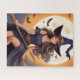Puzzle. Eine fröhliche junge Hexe mit langfließendem Haar fährt einen Besenstiel vor einem großen, glühenden Vollmond. Fledermäuse fliegen um sie herum und tragen so zur bezaubernden Nachtszene bei.